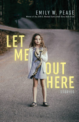 In her debut collection, Emily W. Pease is at work redefining the short story. Let Me Out Here explores the underbellies and strange desires of our neighbors, our loved ones, ourselves. A co-ed takes up with a with a mysterious cab driver who’s been calling every night on her dormitory’s hall phone; a family isolated by their faith hikes to a waterfall in search of healing; a mother sets her balcony on fire after an awkward family dinner; a woman befriends the snakes her preacher boyfriend keeps in their shed. This revealing collection offers a deep empathy for people doing the best they can, despite themselves.